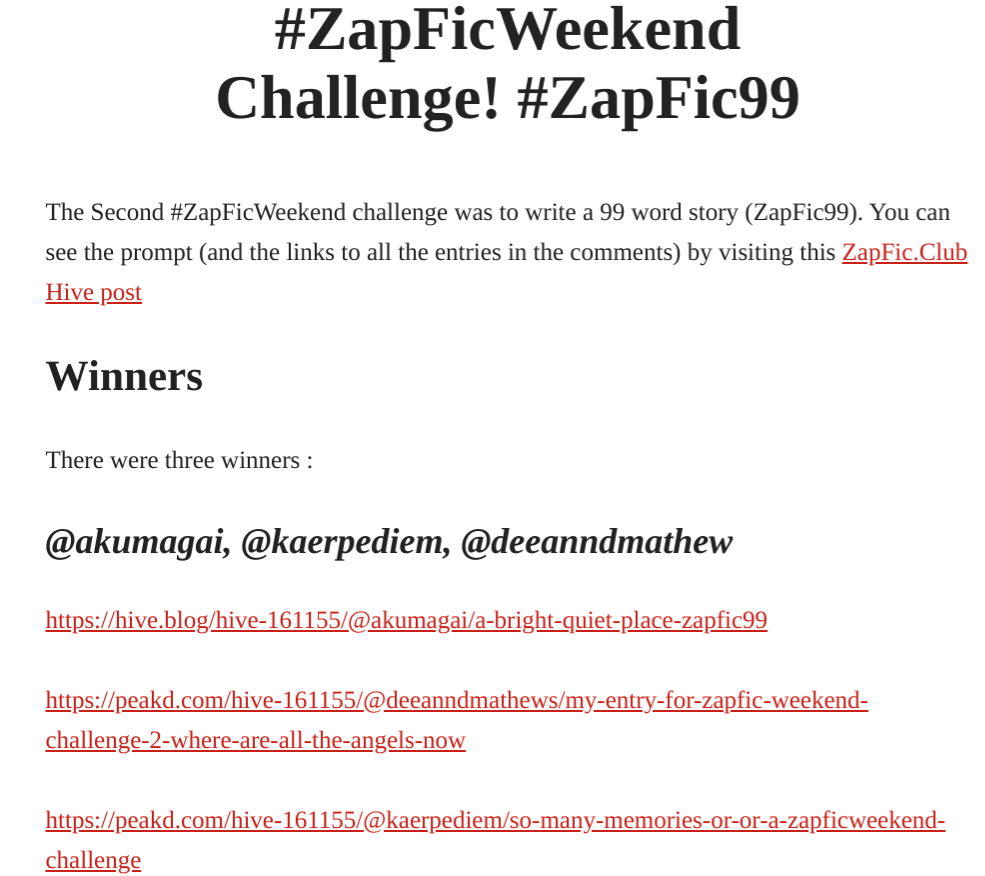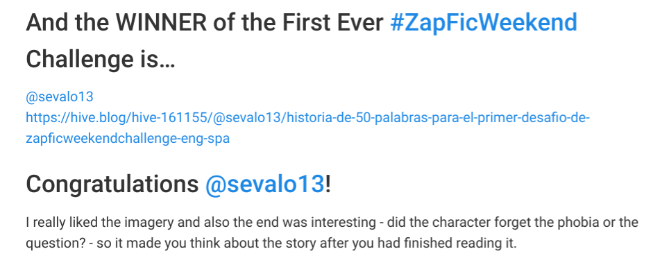 #ZapFicWeekend Challenge Winners The Second #ZapFicWeekend Challenge – #ZapFic99 (11th September – 14th September 2020) The First Ever #ZapFicWeekend (August 14th-17th 2020) https://hive.blog/hive-161155/@sevalo13/historia-de-50-palabras-para-el-primer-desafio-de-zapficweekendchallenge-eng-spa Share this: Click to share on X (Opens in new window) X Click to share on Facebook (Opens in new window) Facebook Like Loading...